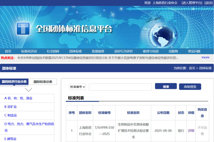 8月5日,上海医药行业协会联合上海市生物医药科技产业促进中心、上海药品审评核查中心、上海农林职业技术学院共同起草的《生物制品中支原体核酸扩增技术检查法验证要求》(T/SHPPA 030-2025)团体标准正式发布。该标准将于9月5日开始实施。